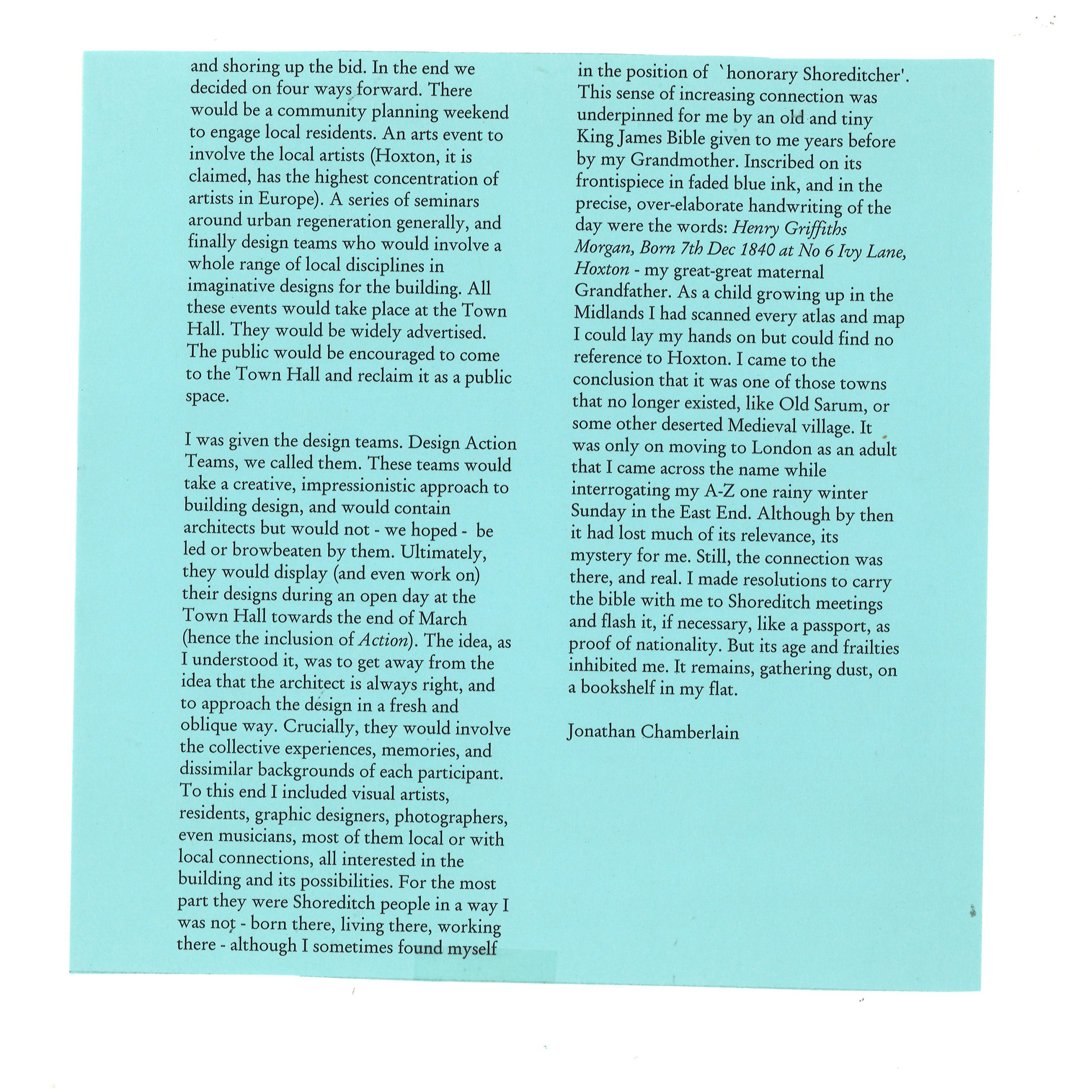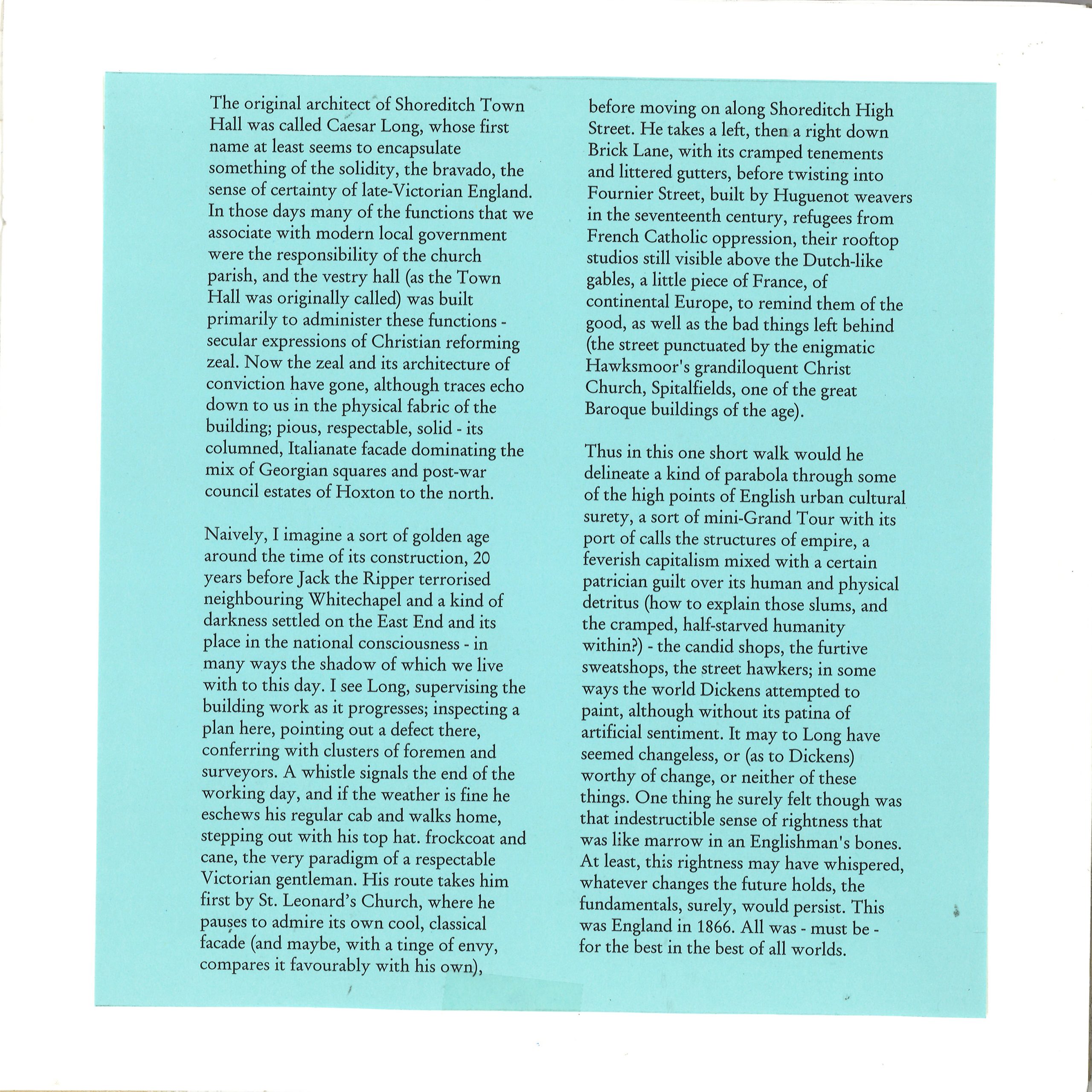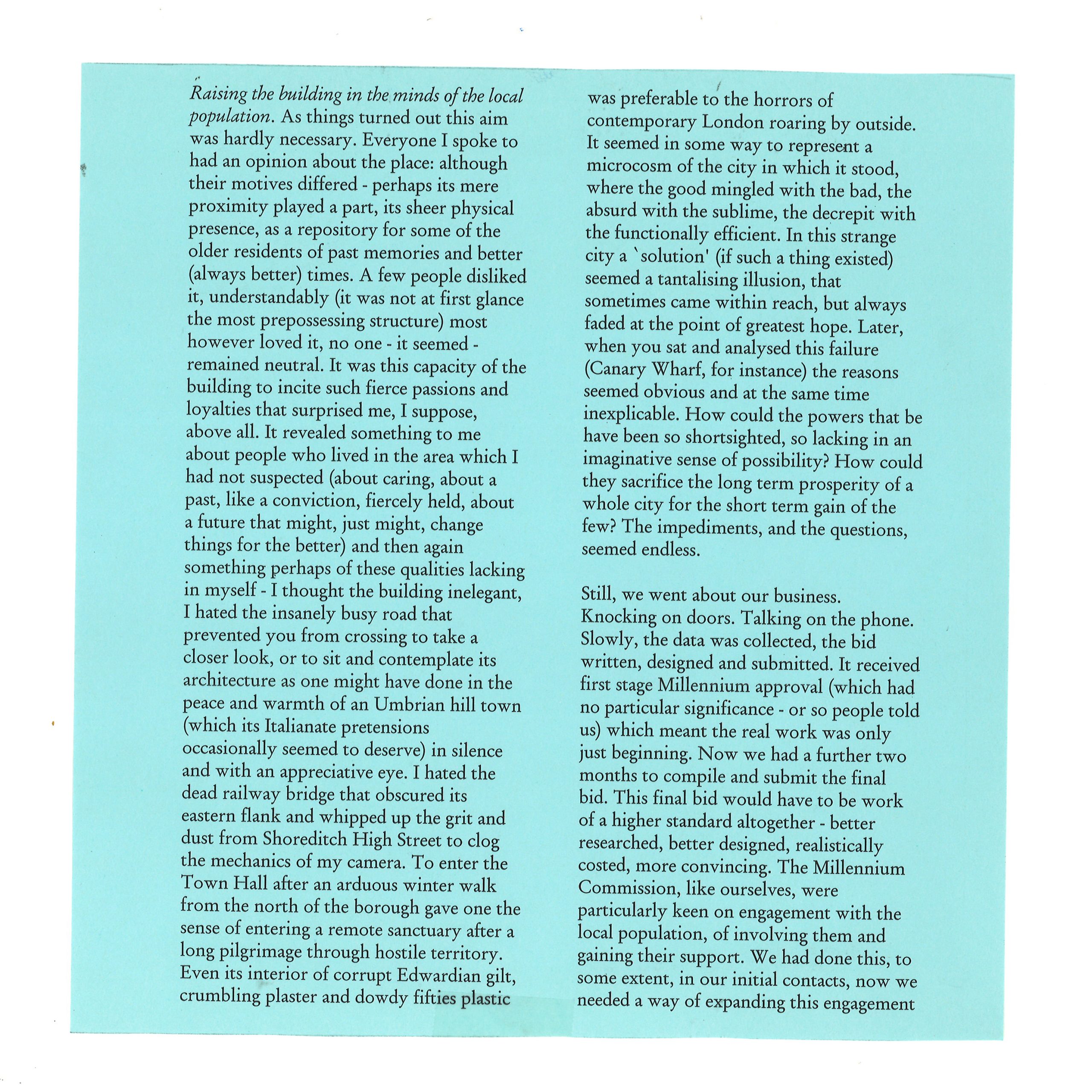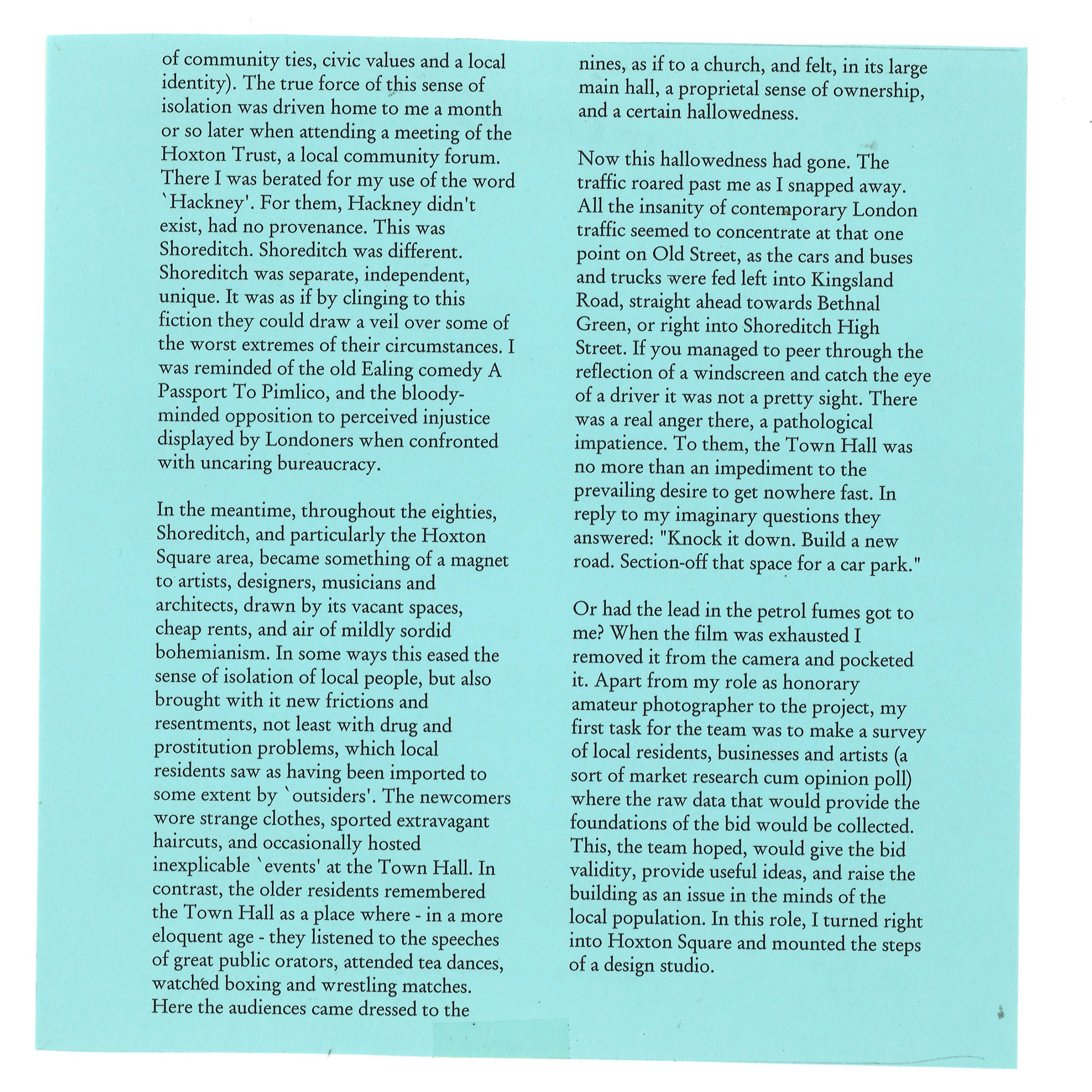 While based at 5 Hoxton Square, Anna Fox and Gordon MacDonald explored the then disused Shoreditch Town Hall as a possible venue for Shoreditch Biennale events. Val invited six photographers- Martin Parr, Clare Strand, Gareth McConnell, Gordon MacDonald, Anna Fox and David Moore to document the Town Hall over a period of two days, and together with Jonathan Chamberlain, came up with the idea of publishing a book about the building. Val made the dummy, which is shown here. The application for funding was not successful, and the book was not published, but the dummy remains, minus one of two photographs.