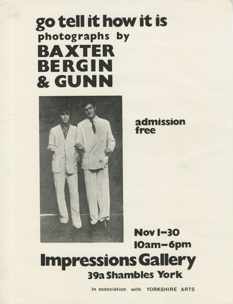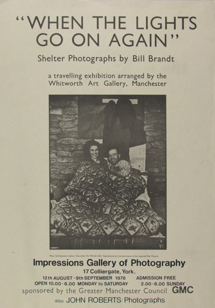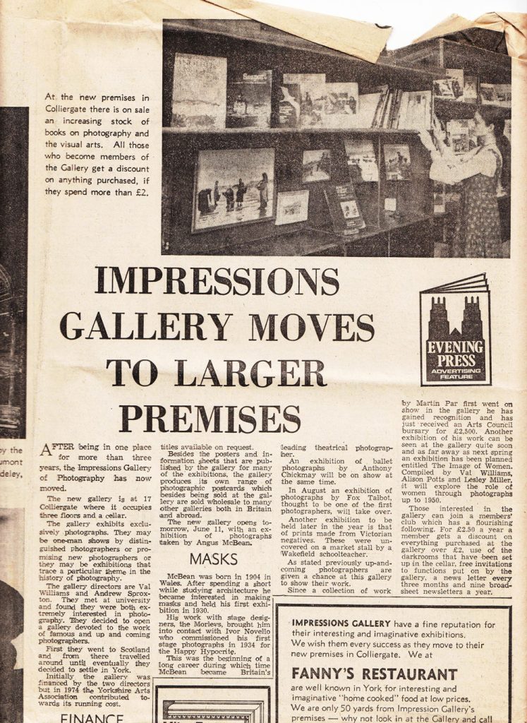 In 1972, Val Williams and Andrew Sproxton, who had recently graduated from the University of Kent, opened the Impressions Gallery in a corridor of a building in Clifford Street, York. They rented the space from a local craftsman, and the first exhibition was a touring show of the work of Swiss photojournalist Werner Bischof. After a few months, Val and Andrew moved the gallery to 39a the Shambles, five rooms on the first and second floor, with access via a back door, which led onto York Market. They bought a converted ambulance, to live in and when it got too cold to live in the van, slept in the upper rooms of the gallery with a Baby Belling cooker and two camp beds. There was no bathroom.