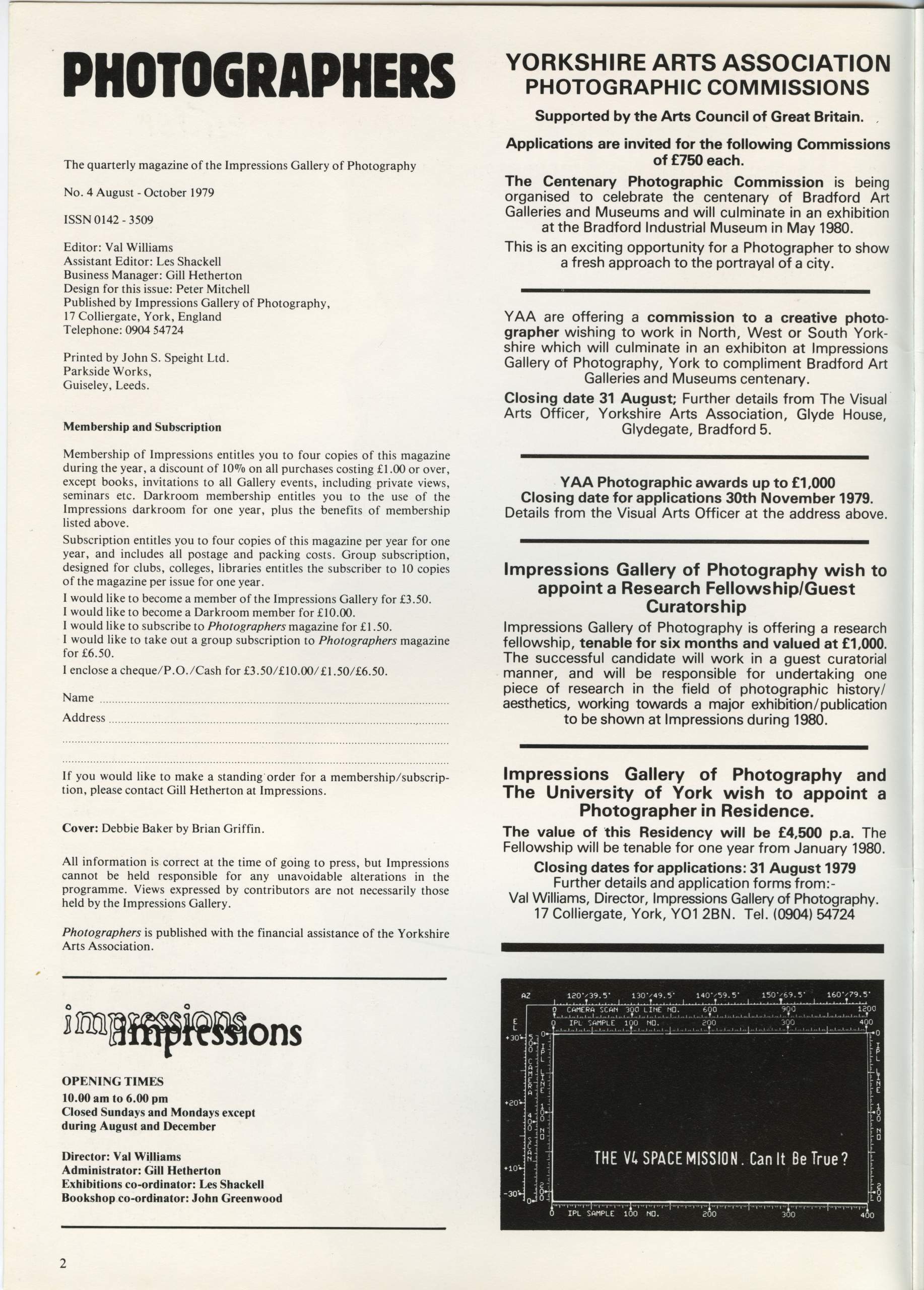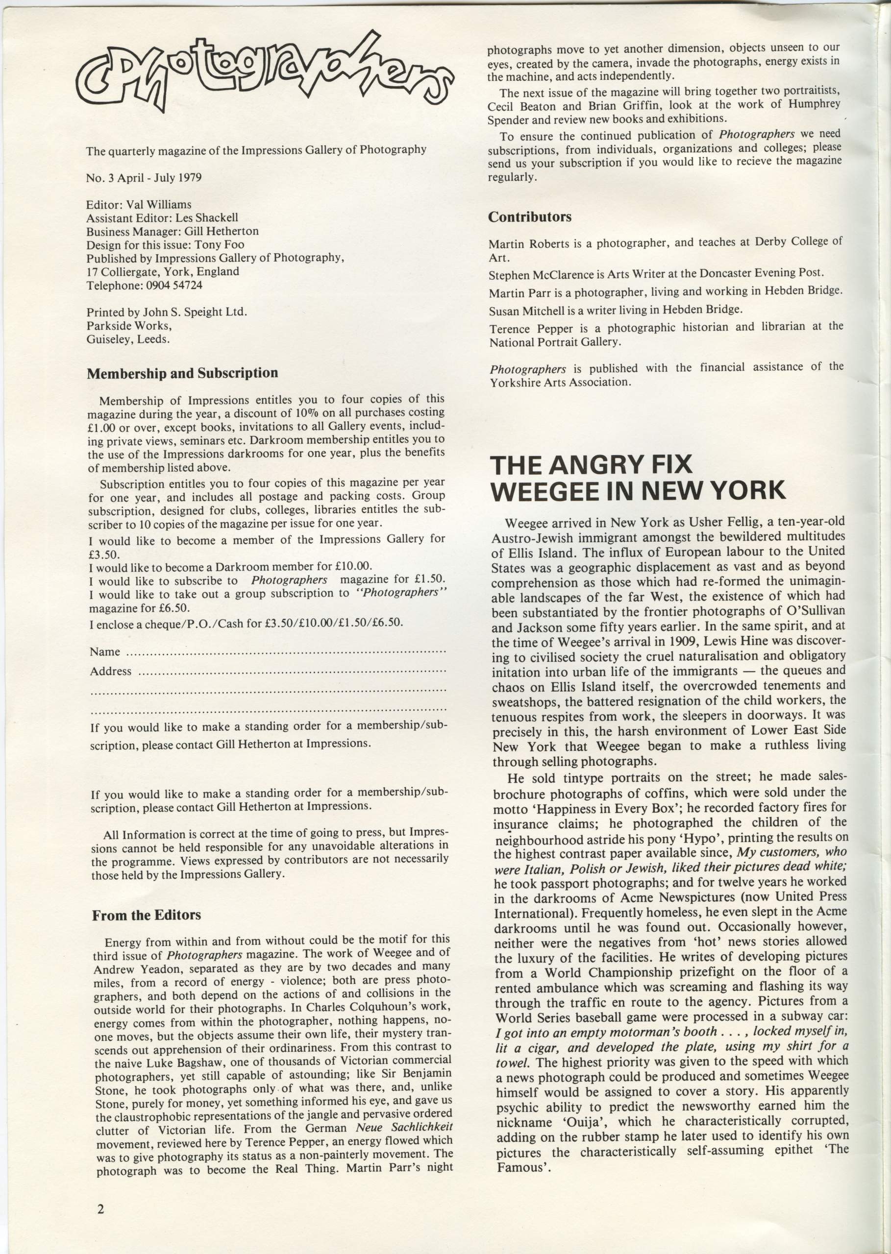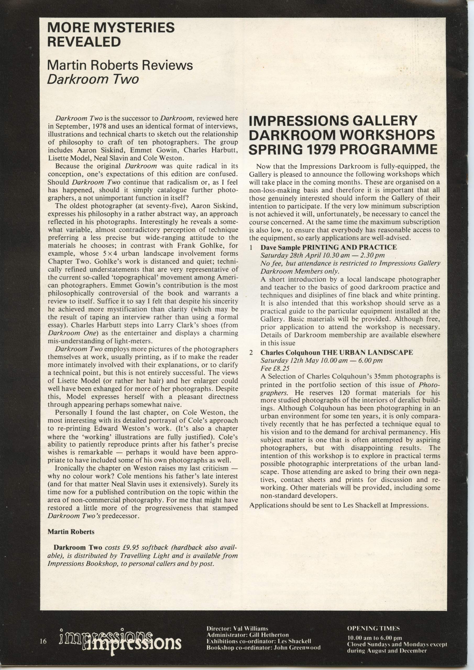 The assistant editor of Photographers was Les Shackell, then exhibitions assistant at Impressions, design was by a local artist and the issues were printed at Speight’s in Guiseley, near Leeds, who were at that time, the printer of choice for many photographers and publishers of photographic books.