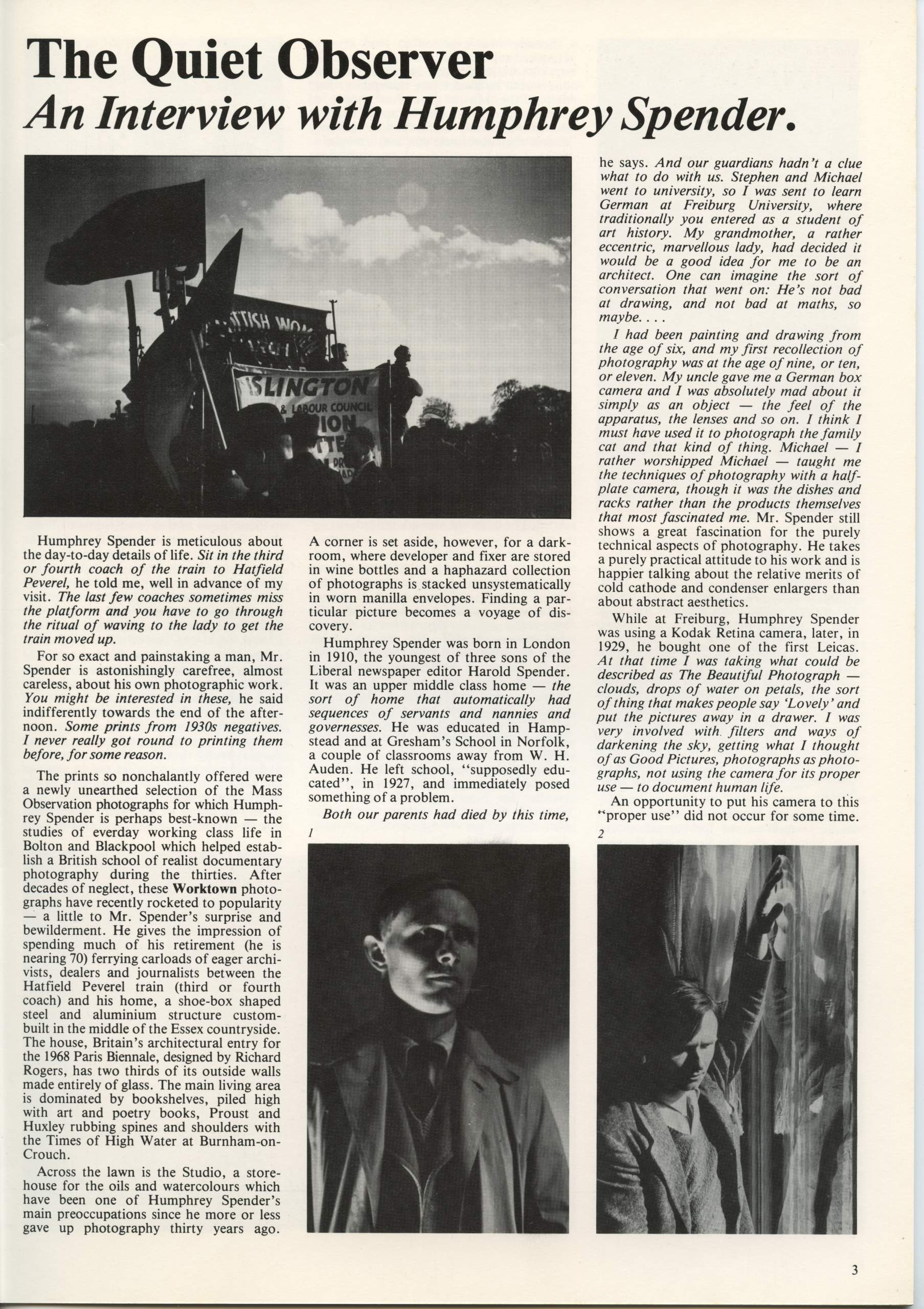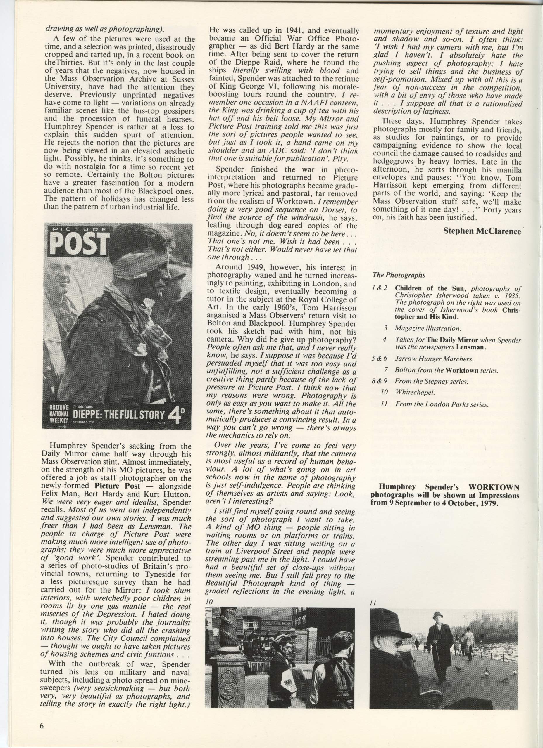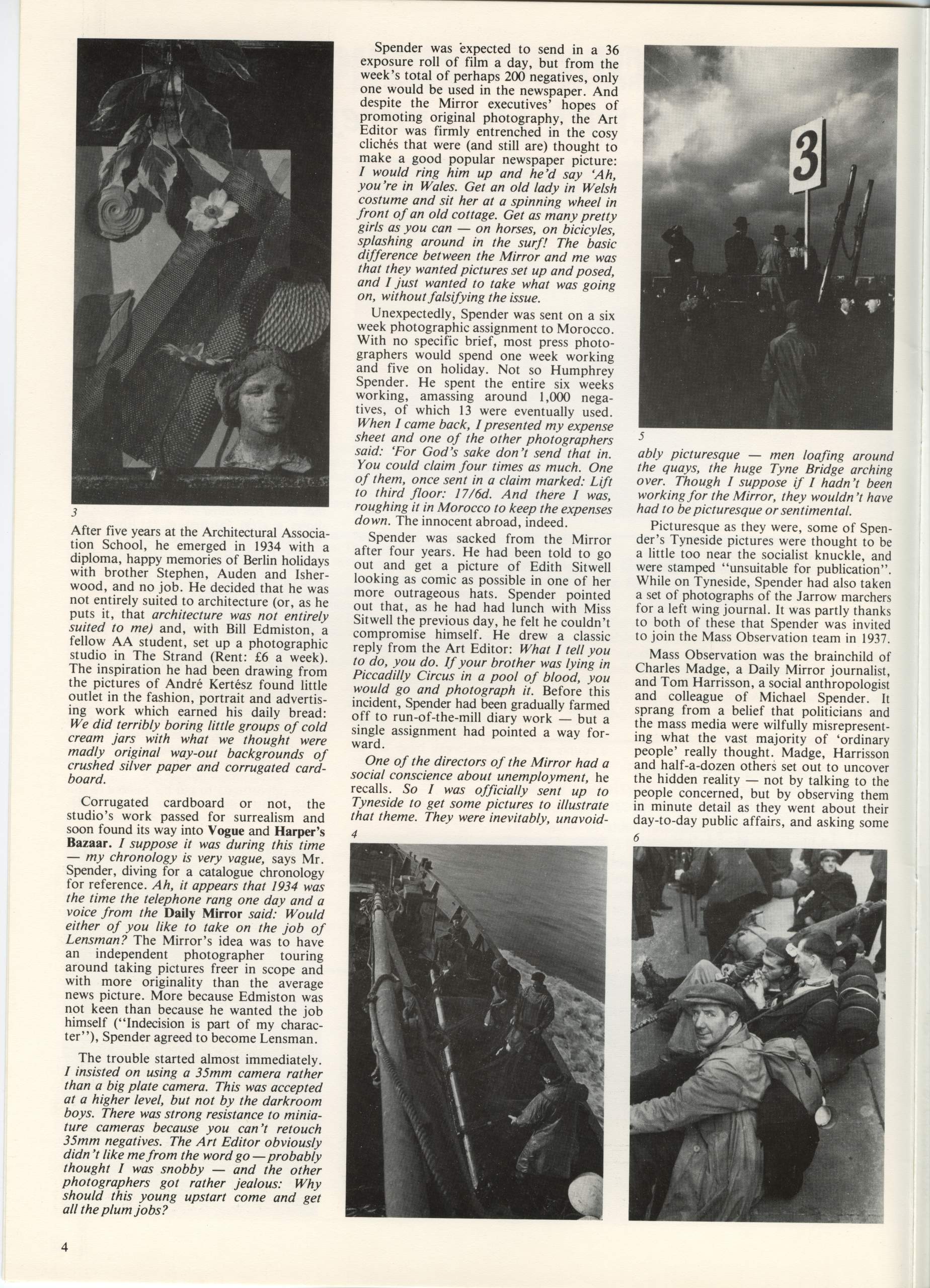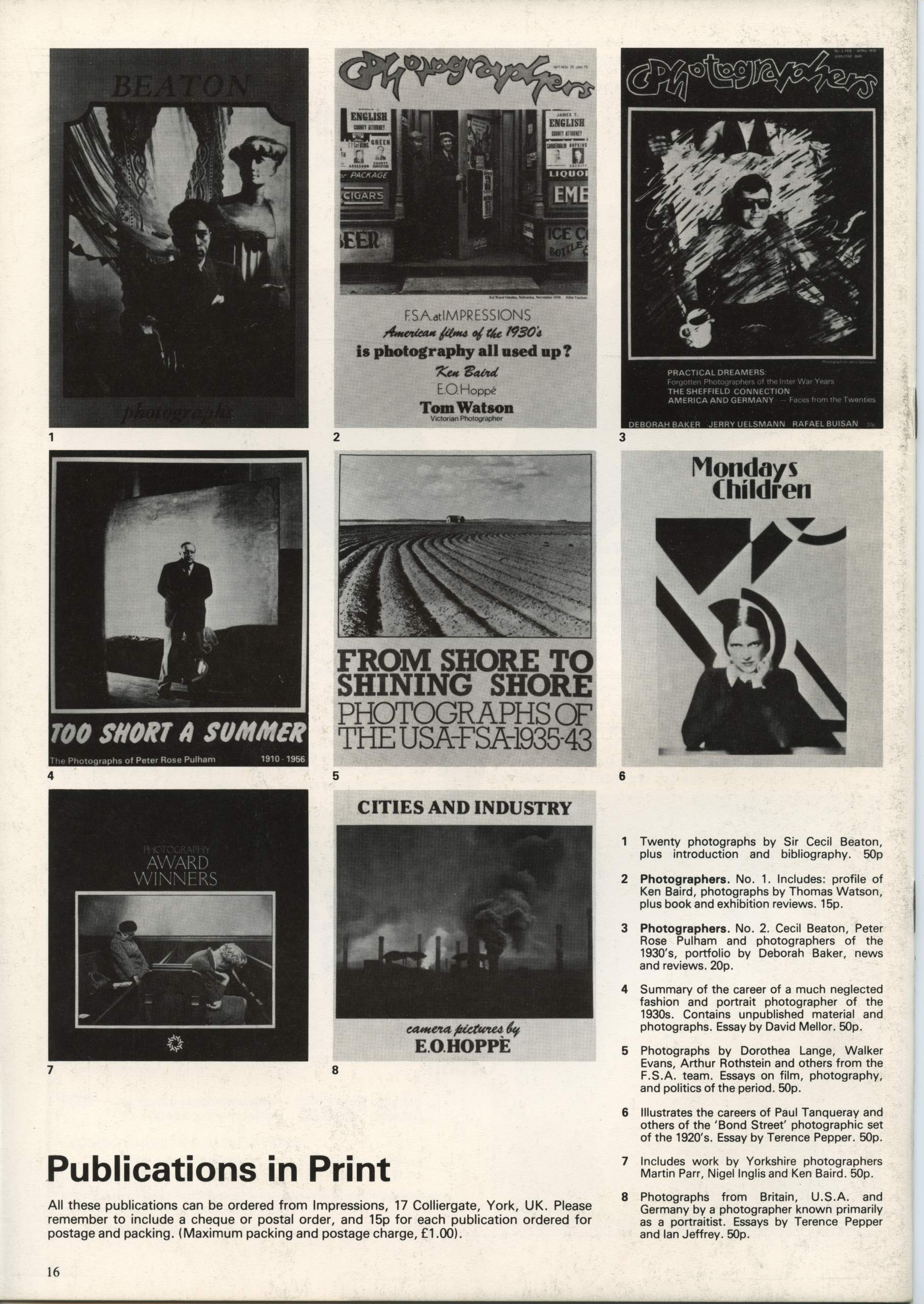 Issue no 1 also included a portfolio of photographs by 19thc Whitby photographer Thomas Watson, a profile of Ken Baird by Val Williams and reviews of the BBC Exploring Photography series and the exhibition 23 Photographers – 23 Directions at the Walker Art Gallery, Liverpool and a preview of the upcoming E. O. Hoppe exhibition at Impressions.