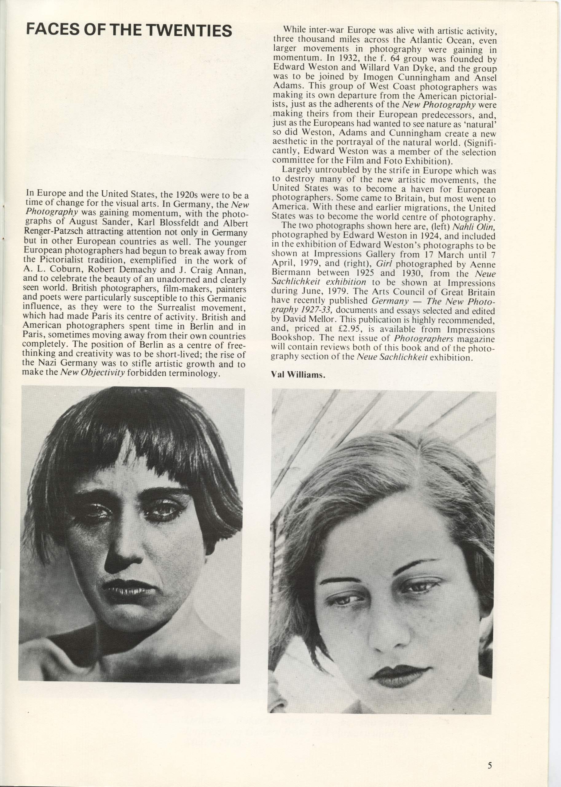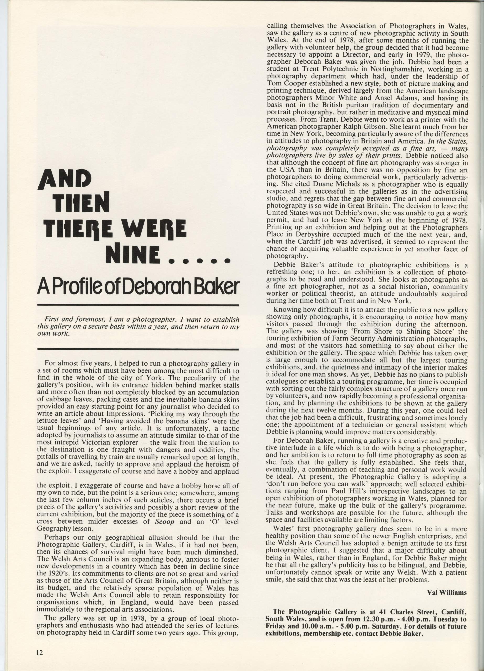 From November 1978 to April 1980, Val edited Photographers magazine for Impressions Gallery of Photography in York. The initial editorial stated that: ‘ Photographers is a new magazine which will serve a dual function, to inform you about the activities of the Impressions Gallery of Photography and to make a wider comment on photography in this country, through the medium of interviews, portfolios, articles and reviews.’ Issues also contained information about membership of Impressions (£3.50), plus darkroom membership for £10.